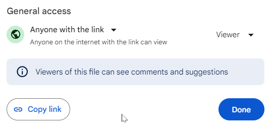 ⚡️Protip: First confirm your file is publicly available with the link, so that "Anyone with the link" can access the file.